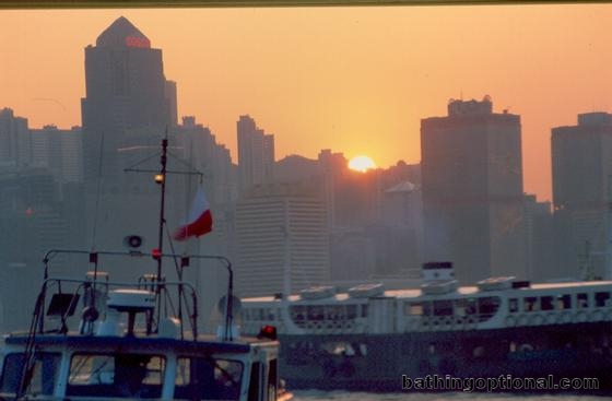 Sun setting behind the hills of Hong Kong Island.