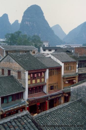 A short half hour bus ride from ugly Guilin is beautiful (but touristy) Yangshuo. This was the view from our guesthouse. Yangshuo is built literally amongst karst peaks. China, Yangshuo - 08-Feb-03