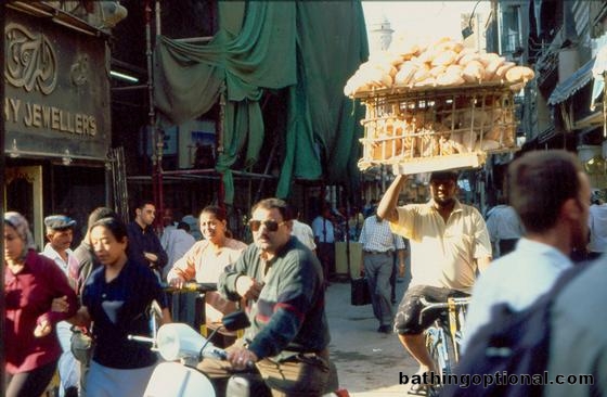 Bicycle bread delivery. How he balances that while veering through the crowds, well never know. Egypt, Cairo - 17-Apr-03