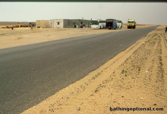 We rode on a desert highway like this for hours before arriving in the desert oasis town of Baharia far into Egypts desert-filled west. Egypt, Baharia - 19-Apr-03