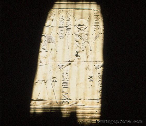 Inside one of the temple chambers with light from a gap in the ceiling. Egypt, On the Nile - 27-Apr-03