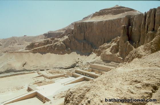 View down over one of Luxors more famous temple buildings built right into the cliff. Egypt, El-Uqsor (Luxor) - 28-Apr-03