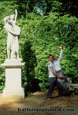 Maciej and Ashe trying (unsuccessfully) to mirror a statue.