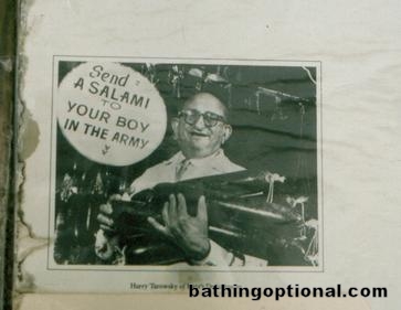 Across the Brooklyn Bridge now, our Manhattan tour begins in the Lower East Side. The north and eastern parts of the Lower East Side are known as a Jewish area. On East Houston Street we wandered past the famous Katzs Delicatessen and in the window we found this old ad... United States, New York City - 09-Oct-03