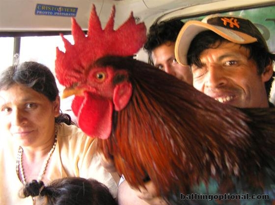The passengers behind us on one of many mini-buses we took that day including the rooster that would spontaneously unleash a cock-a-doodle-do that shook the entire van ever 20 minutes or so. Peru, Jaen - 03-Aug-06