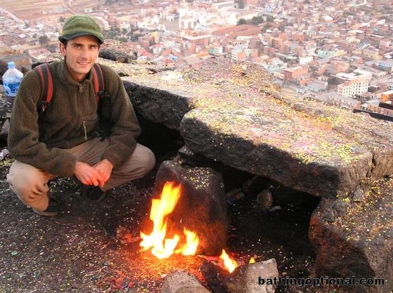 Maciej by one of the small candle and fire offering spots up high on the hill above Copacabana. Bolivia, Copacabana - 13-Aug-06