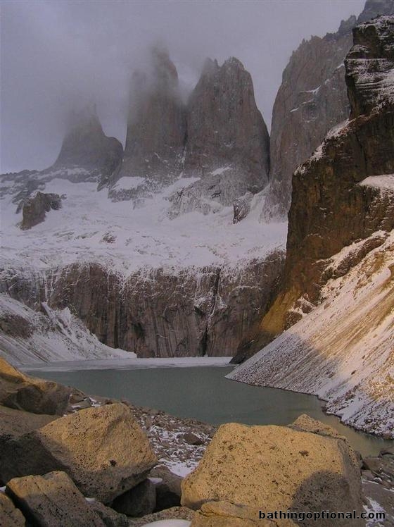 The bright red of the first minutes of sunrise is over and the day begins. Chile, Torres del Paine National Park - 23-Oct-06