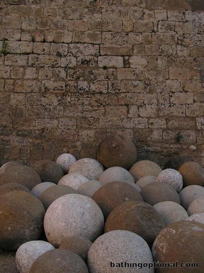Old defensive boulders lay at the foot of the city wall in Rhodes.