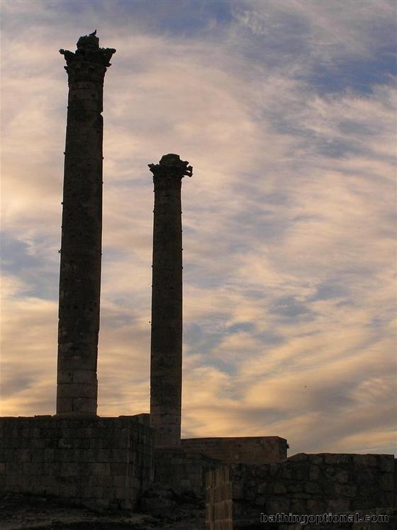 Sunset sky over the Corinthian columns on the grounds of Sanli Urfas citadel. Turkey, Sanliurfa - 01-Dec-06