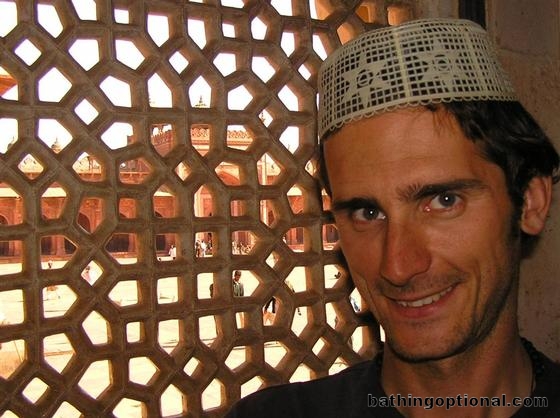 Maciej wearing the mandatory, plastic Muslim head garb.