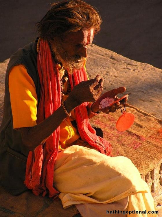 Holy man putting on his make-up.
