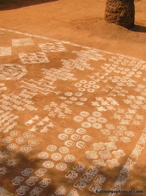 A southern Indian tradition, chalk images in front of homes painted daily to bring good luck to the home. India, Hampi - 07-Feb-07