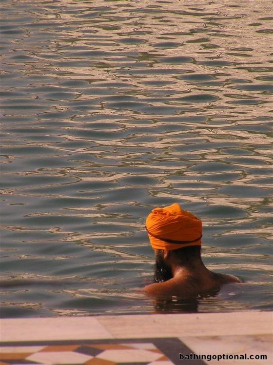 Sikh pilgrims take a holy dip in the temple pond before visiting the temple across the bridge. India, Amritsar - 25-Mar-07