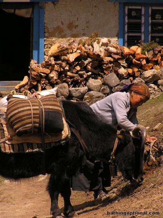 Day 2 : Monjo to Thami.\r\nGearing the yak up for a long walk through the mountains. Nepal, Mt. Everest - 01-Apr-07