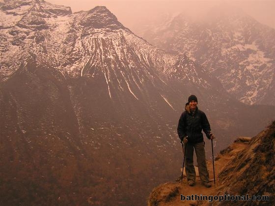 Day 8 : Dugla to Phortse.\r\nAshe on the precarious cliff trail connecting Pangboche and Phortse. The weather changed quickly and, before we knew it, it was snowing! Nepal, Mt. Everest - 07-Apr-07