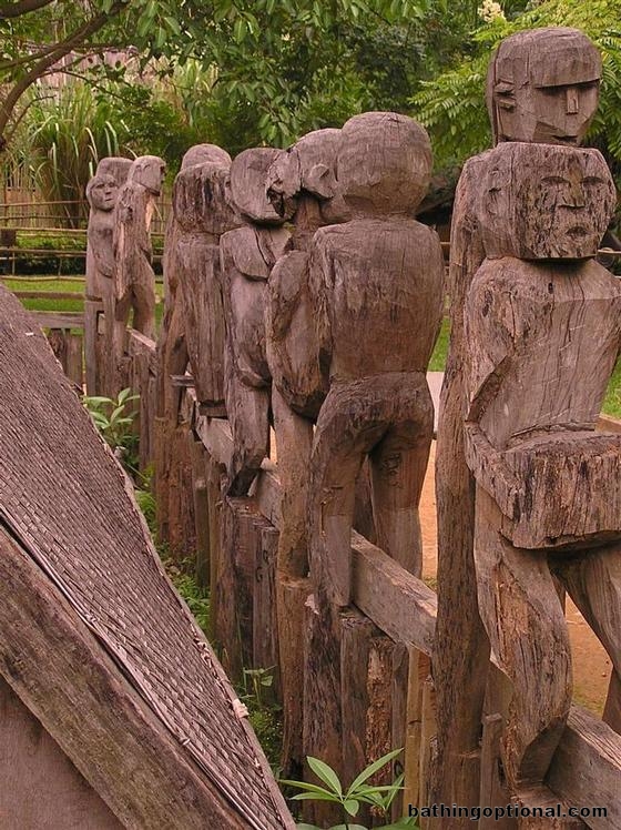 Wood figures surround a tomb. The peoples of Vietnams Central Highlands believe that these figures will accompany the dead into the afterlife. Vietnam, Hanoi - 31-May-07