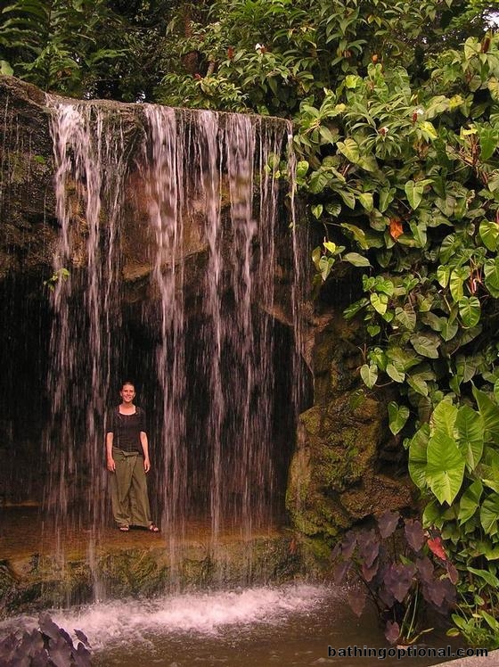 Lady in the gardens hiding out behind one of many wonderful, man-made waterfalls. Singapore, Singapore City - 20-Jun-07