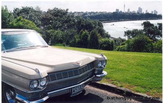 Sleek automobile parked high in Aucklands fabulous coastal residential areas with downtown Auckland in the distance. New Zealand, Auckland - 13-Nov-02