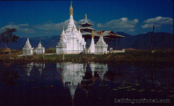 A brilliant white temple we saw off to one side as we made flew by in our motorboat. Myanmar, Mandalay - 16-Jan-03