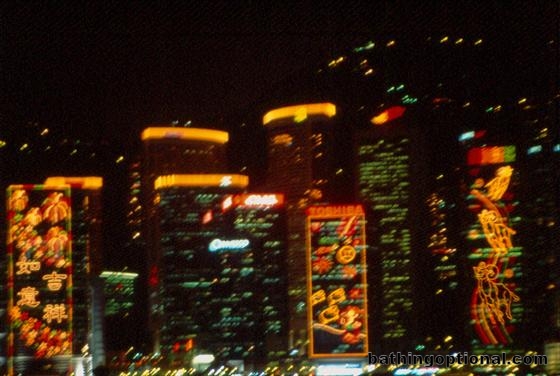 During the Chinese New Year, the buildings of Hong Kong are even brighter. Its a little blurry but maybe you can make out the goat for the year of the goat. China, Hong Kong - 28-Jan-03
