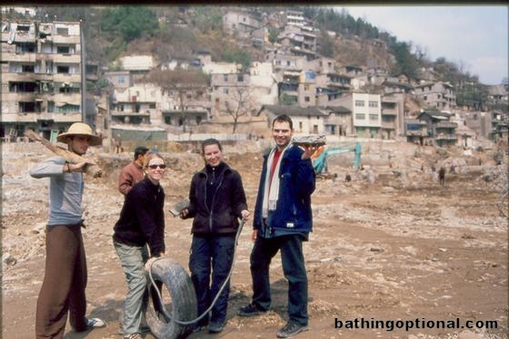 All of us trying to create some kind of construction-related pose with the shell of a town behind us. China, Three Gorges - 03-Mar-03