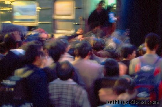 Stampede! Our departure from Xian was an unbelievable scramble to board this train followed by a ride in the most packed train weve ever been on or imagined. China, Xian - 06-Mar-03